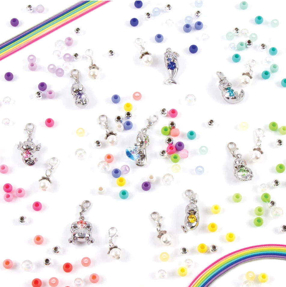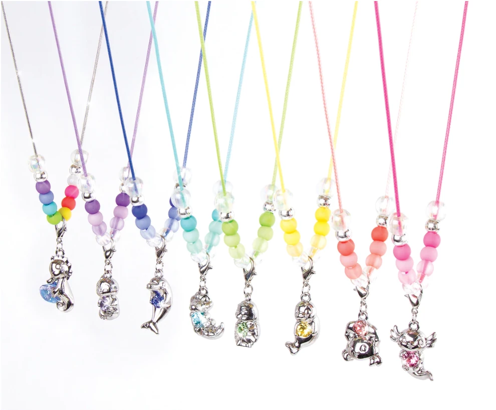 Unbox, unlock, and unleash the treasures hidden inside the Crystal Secrets Treasures Jewelry Kit. Kids will love the unboxing experience that reveals one of the 8 aquatic characters within this line, each containing aΒ real crystal jewel. This DIY jewelry set invites kids to make a bracelet and a necklace with the included beads andΒ a crystal charm. The completed necklace and bracelet can be stored inside the locking seashell trinket box. Collect all 8 characters. Each kit is sold separately and contains 56 pieces.