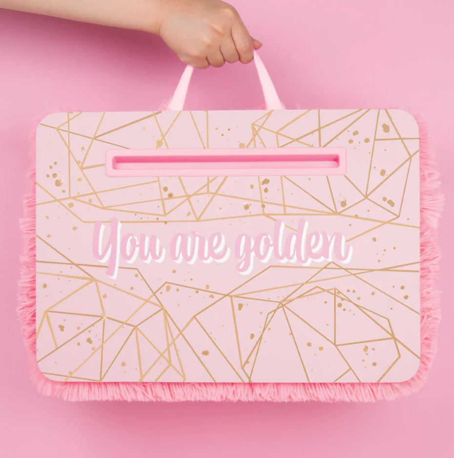 This lap desk could make homework stylish! The Pink and Gold Faux Fur Lap Desk features an extra lush, faux-fur shaggy pink pillow which provides ultimate comfort when using on your lap. The pillow fill made of polystyrene beads is easily movable so the desk can be easily molded to fit comfortably on your lap or quickly level out on a harder surface. The desktop features a “You Are Golden” positive message in golden foil inscribed on the top. The desktop has gold foil abstract designs that will brighten any room.