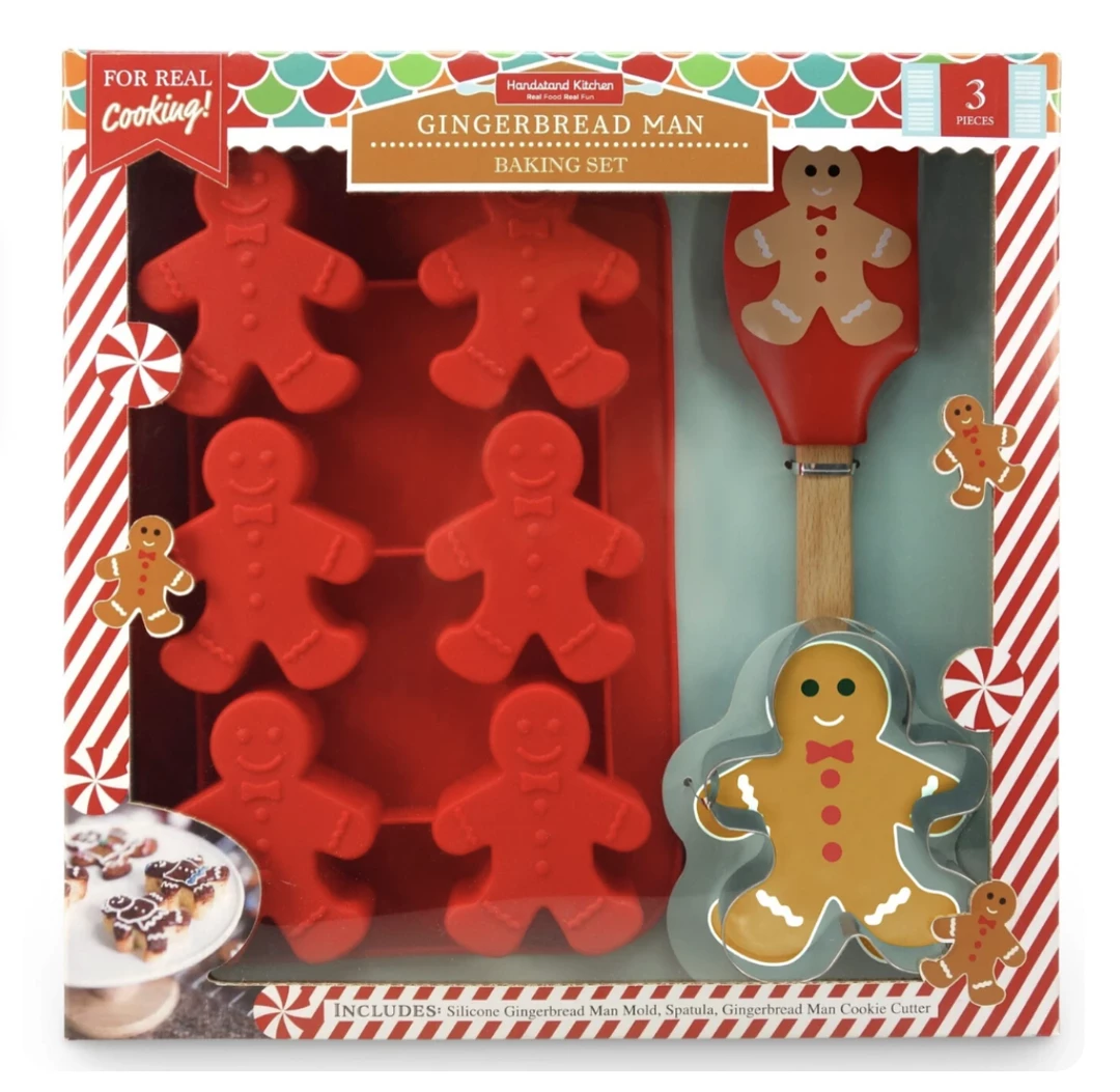 Run, run, as fast as you can, to catch this gingerbread man baking set! Make holiday baking a yearly tradition making gingerbread man-shaped treats with this 3 piece baking set for real kitchen use. Featuring a gingerbread man silicone baking mold, cookie cutter and spatula, youโll have everything needed to bake gingerbread man-shaped cupcakes, muffins, cookies, frozen treats, chocolates, ice cubes, crayons, soaps, and more!ย ย