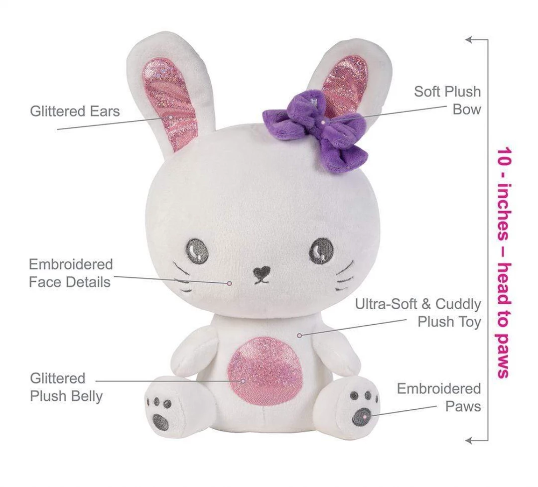 Hippity hop—the most ADORAble stuffed bunny to play with in your nursery! Bunny glows with joy and fun, and always aim to put a smile on your face! She inspires our Be Bright Doll Lulu to always #BeKind and keep a tender heart for every #BeBright friend that needs help! This soft toy is the cutest bunny plush with her heart-shaped nose and dolly eyes. A tickle in her glitter belly and floppy ears, who doesn’t fall in love with this plush cutie?