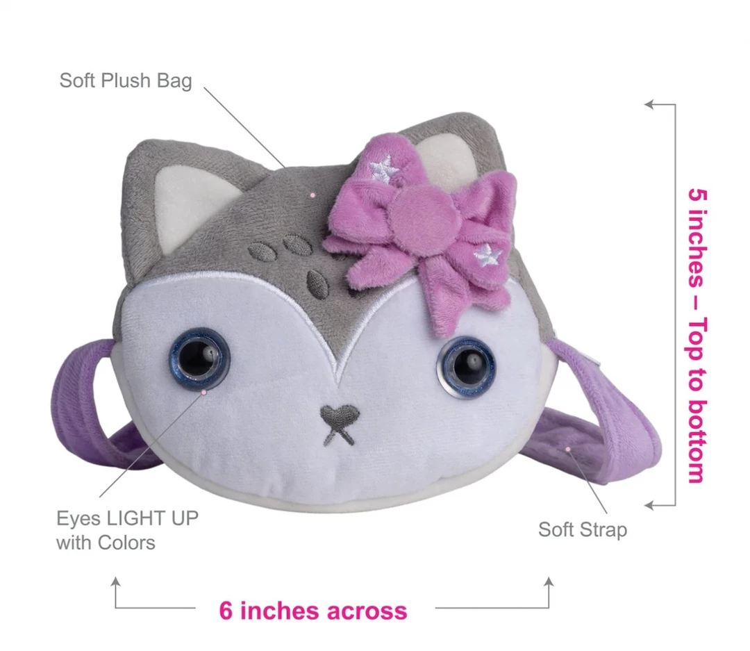 Be Bright Purse Wolf is a color-changing light-up bag with a zippered pocket detailed with heart-shaped wolf nose, a pink plush bow to accessorize, and a purple plush strap. This interactive animal purse is a great choice for fun mix-and-match fashion play! Makes a great gift for ages 3 and up.