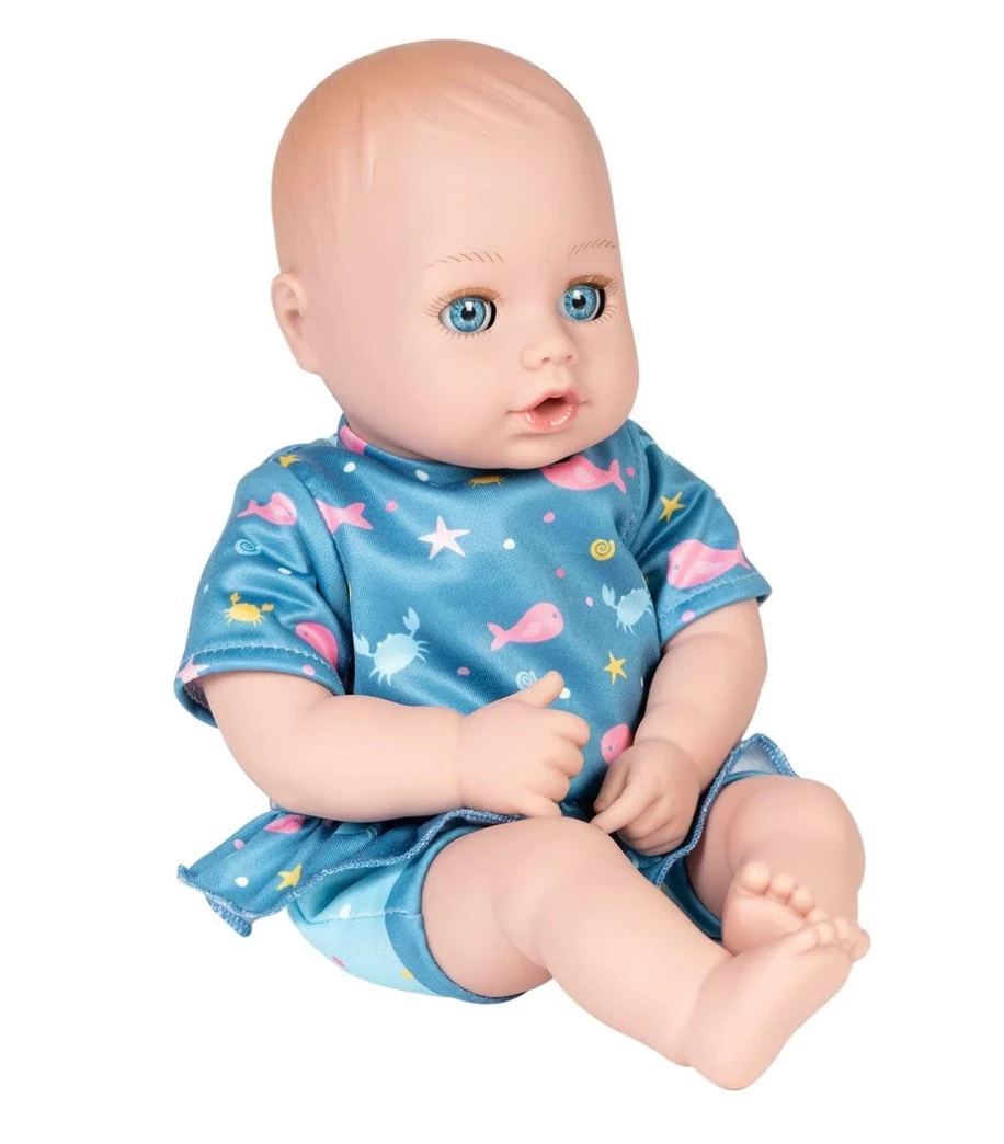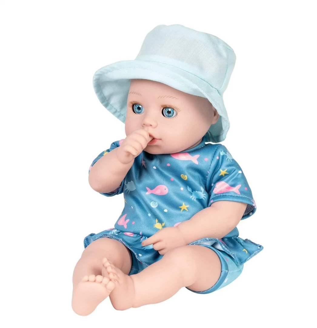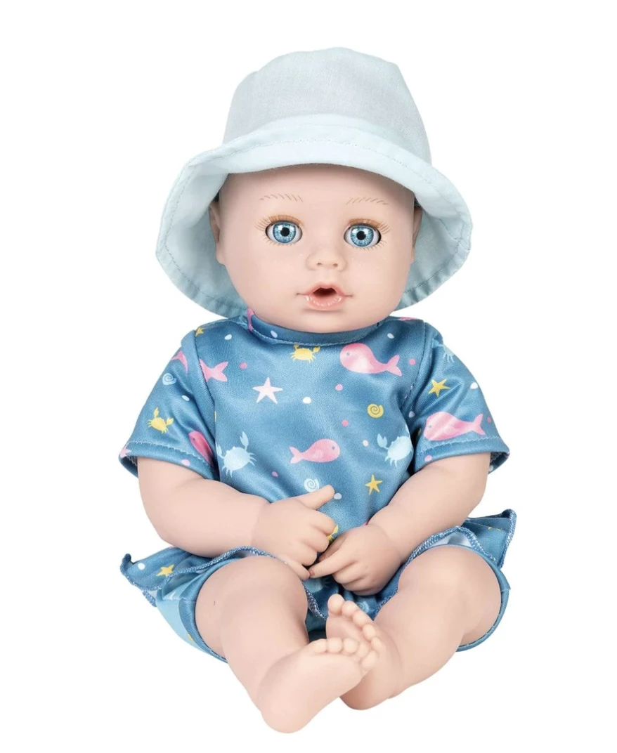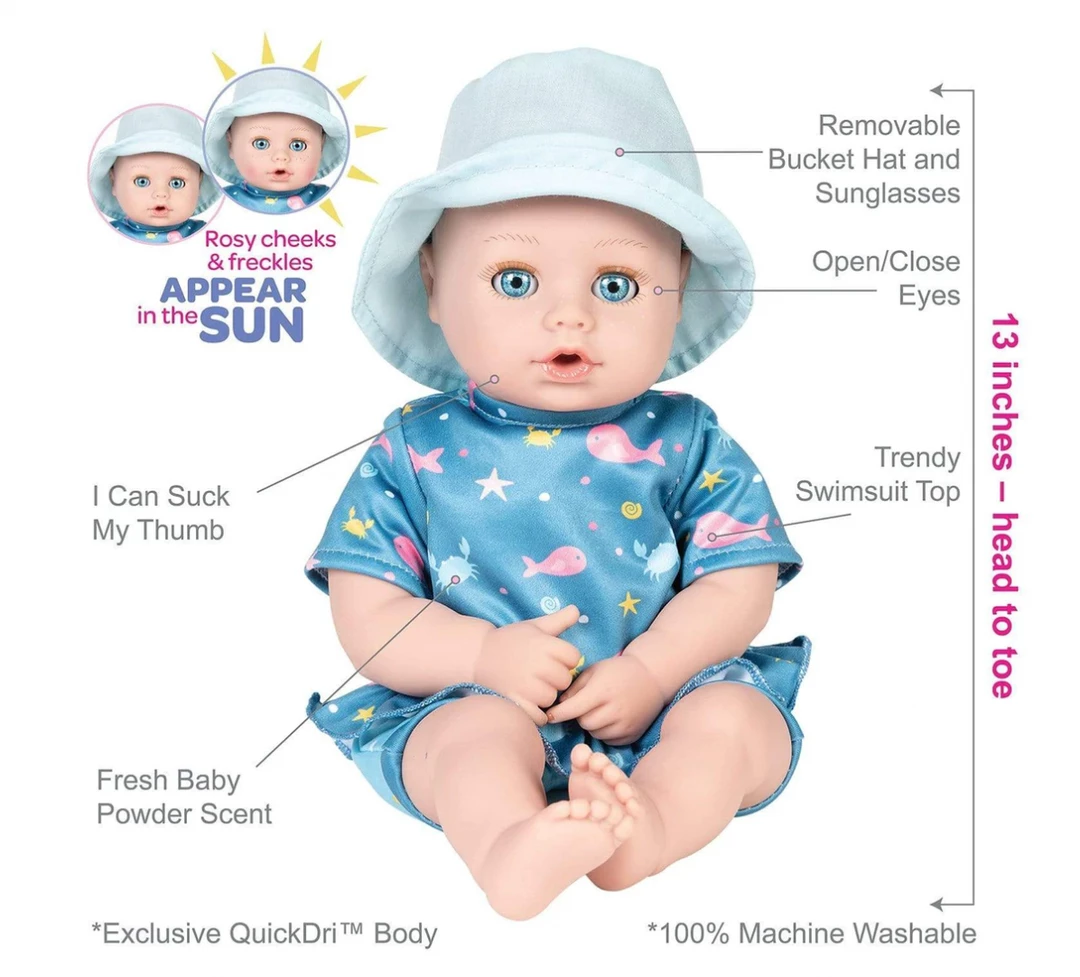Ready for fun in the sun, Adora interactive baby doll Beach Baby Sunny is looking fab & cool in her blue ruffled swimsuit top and a matching blue sun bucket hat! This washable baby doll is ready to hit the beach with you with her amazing sunlight-activated features: her rosy cheeks and freckles magically appear in the sunshine! Sunny loves to play in the sun and sand, and when itβs time for a bath, no worries as this 13β soft beach doll is made from an exclusive QuickDriβ’ body that dries in no time. Donβt forget her yellow-brimmed sunnies while sheβs under the sun! With her ADORAble baby doll face and fun features, she makes a great doll for all the little boys and girls!