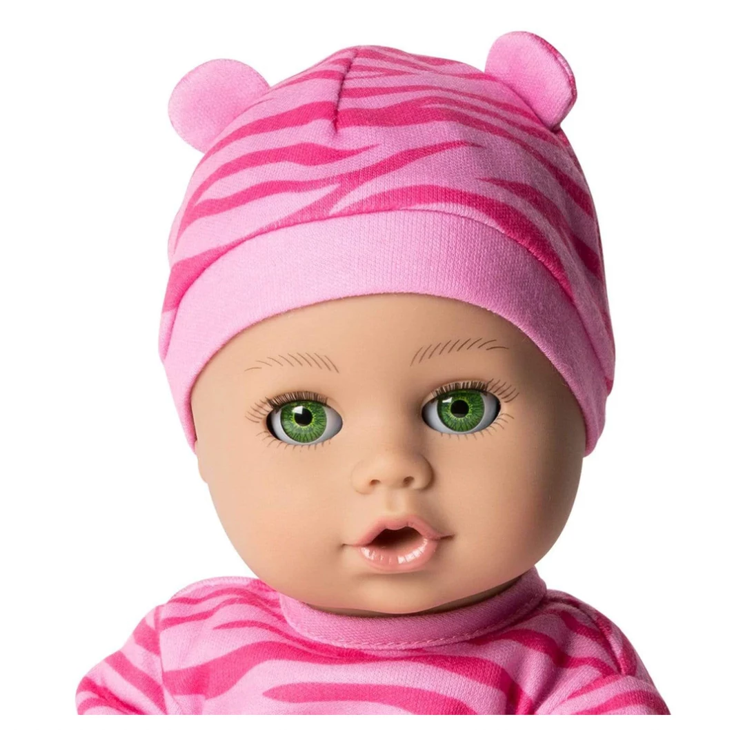 No other tiger is as cute as Adora PlayTime Baby Tiger Bright! She’s ready to play in your playroom and be your little one’s favorite 1st baby doll with her beautiful hazel green eyes and cute baby pouted lips! This 13-inch soft baby doll set comes with pink tiger-printed onesie and a matching baby beanie with little tiger ears to add sparkle to this already ADORAble baby doll. It also arrives with a pink Adora baby bottle that perfectly fits her mouth.