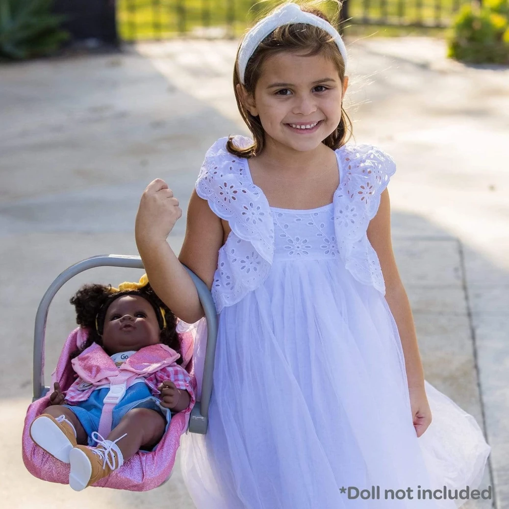 Adora Glam Glitter Car Seat Carrier will add glitter fun to your life! Take your baby dolls and toddlers wherever you go with this trendy toy accessory that has a beautiful sparkly pink fabric and can fit stuffed animals, plush and vinyl dolls up to 20” in size like our toddler doll Happy Camper and the rest of our ToddlerTime Dolls in collection.
