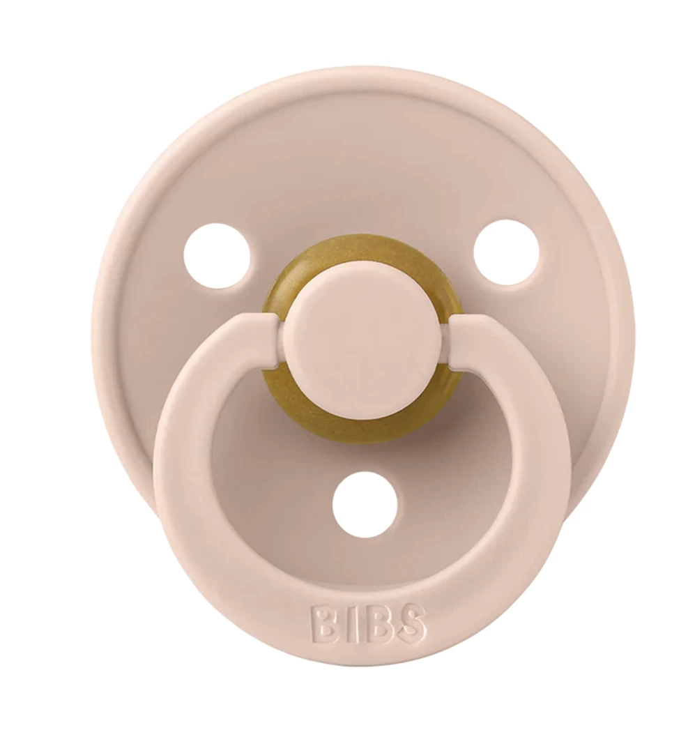 Our Colour pacifier is the original BIBS pacifier and has been on the market for over 40 years. It has the signature round BIBS shield with three vent holes and round BIBS engraved handle ring.