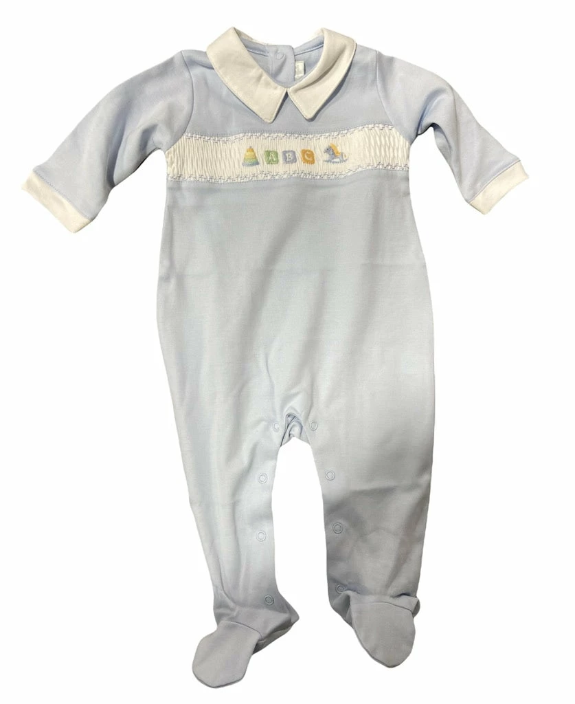 Blue Footie with Peter Pan Collar and ABC Blocks Smocked Details.