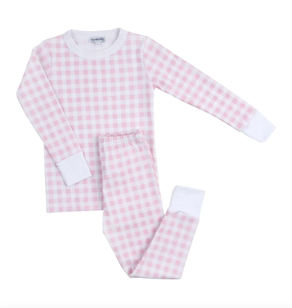 Adorable Magnolia Baby long pajamas with light pink checks. Set contains long sleeve shirt and long pants. Made from 100% Peruvian pima cotton, this outfit is as soft and comfortable as it is cute. This print is available in other styles as well, perfect for sibling matches!