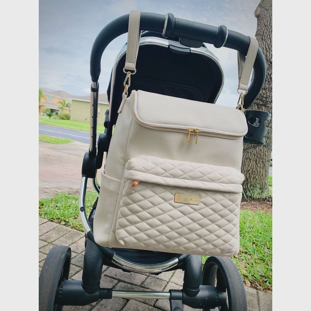 Our original diaper bag made from premium soft vegan leather, the Lily comes with – Adjustable shoulder & backpack straps Stroller straps to attach to the stroller Pockets – including 1 insulated, 2 zippered, 2 side, 3 internal Studded feet Padded changing mat Fresh white interior The easy access large opening makes finding what you need a breeze, and the slouchy design makes it an easy choice for Moms. Moms can wear it their way with the choice of straps included.