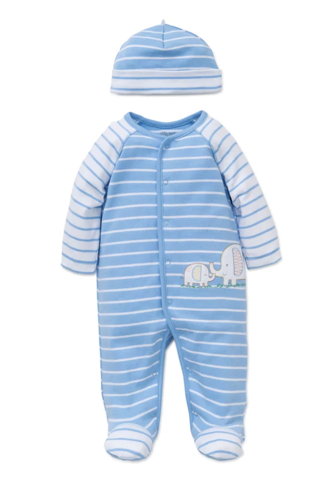- Make the most of those precious first memories in this comforting luxury cotton elephant footie and hat set, featuring a gentle, full-snap front for quick and simple changing.