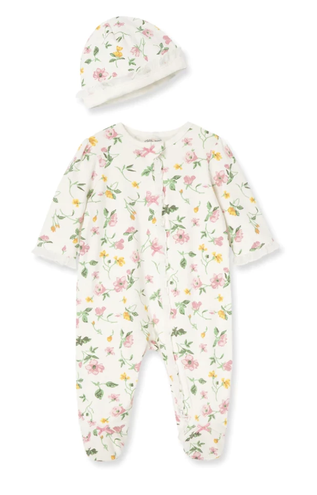 - Teensy ruffles trace the length of a hidden full-length zipper on this newborn baby girls’ cotton footie and hat set patterned with teacup flowers.
