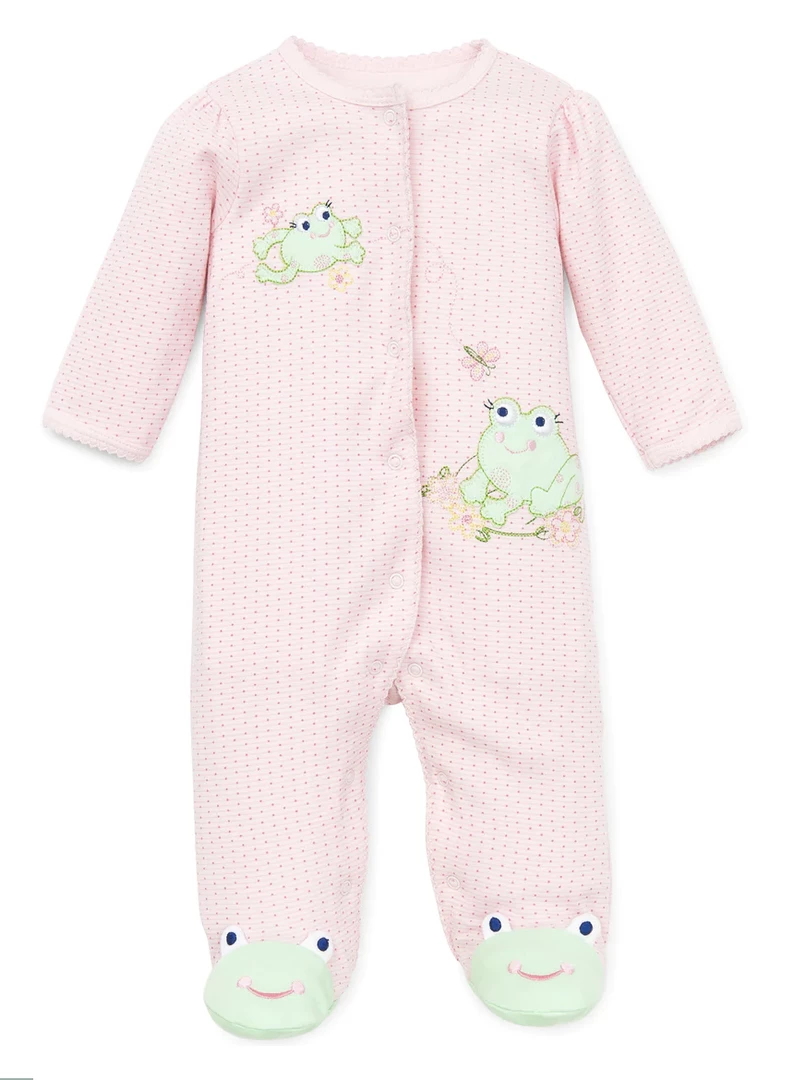 - Your baby girl will be cute and comfortable in this frog friend footie with frog toes. The frog friend one-piece footie features an all over geo print with frog appliques. Outfit is 100% cotton, and snaps from the neckline to the feet for easy dressing. Long sleeves are perfect for extra comfort.