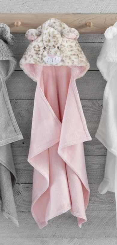 Velour terry cloth infant sized towel features faux fur hood with dimensional leopard facial features and back loop tag for hanging. Sized to fit ages up to 18M.