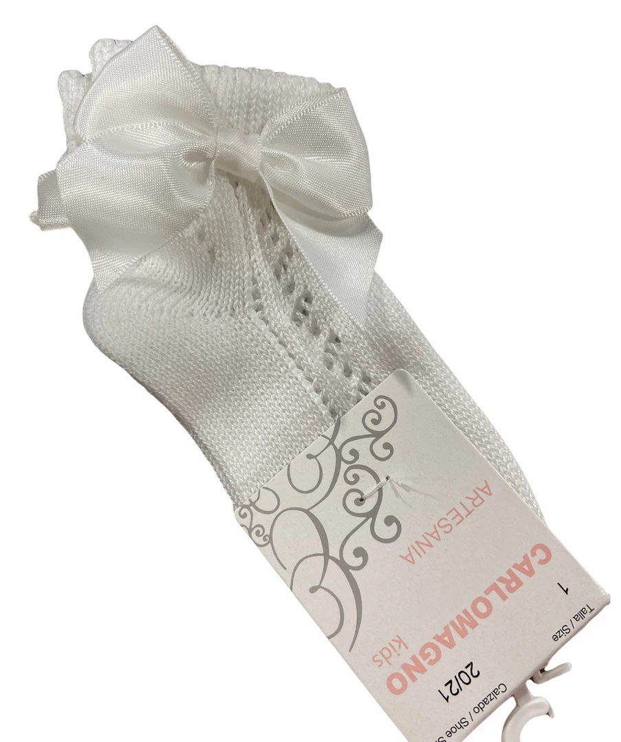 Infant Scottish Yarn Knee Socks with Silk Bow in White.Β