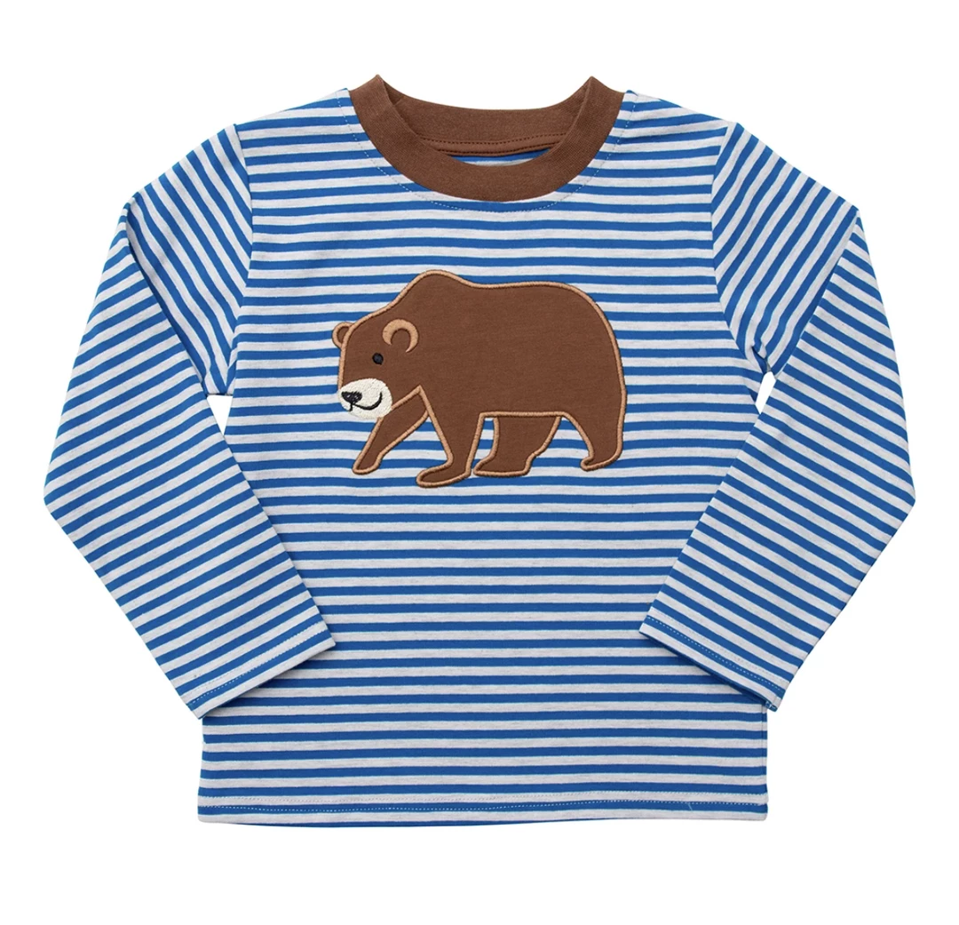 Blue tones boy’s shirt with an applique brown bear.ย Coordinating brown collar..ย Very soft fabric 95% cotton 5% spandex.ย Perfect to add your own personalization.