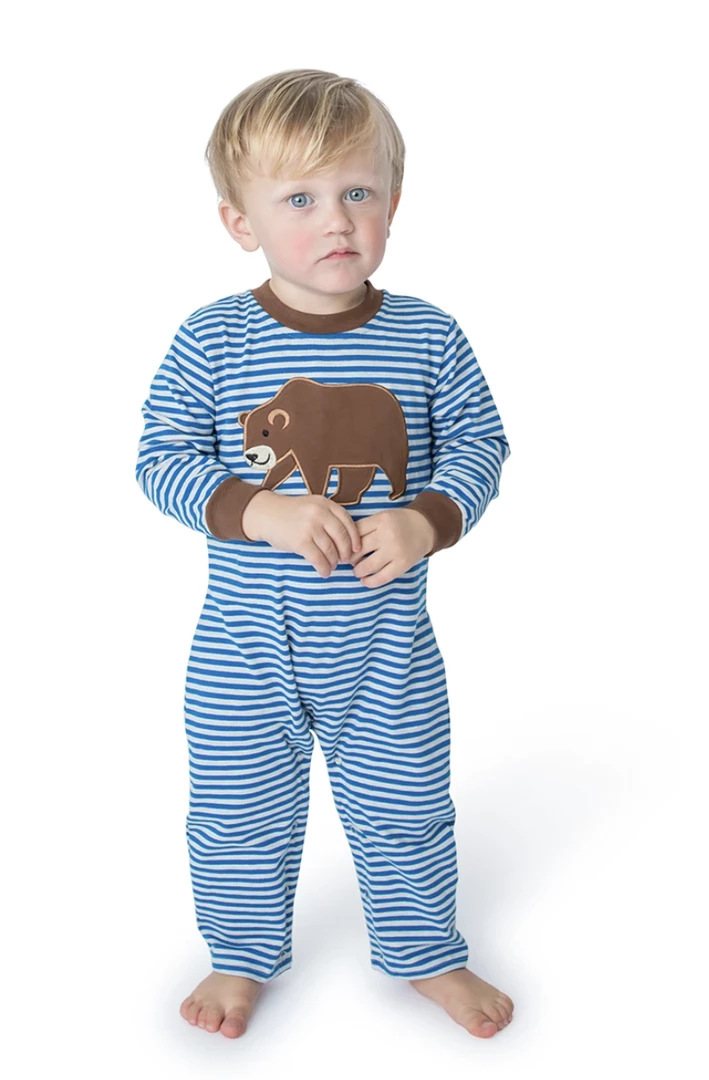 Blue tones boy’s romper with an applique brown bear.Β Coordinating brown collar and cuffs. Snaps on the legs for easy changingΒ Very soft fabric 95% cotton 5% spandex.Β Perfect to add your own personalization.