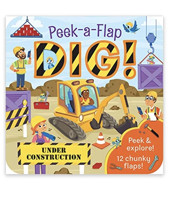 Bzz, bzz, bzzrt! Peek and explore construction sites in this lively, interactive Peek-a-Flap! Little ones will love exploring every construction-themed page filled with fun facts, new vocabulary words, and surprises found under sturdy lift-a-flaps while learning all about the tools and trucks that help build roads, houses, and skyscrapers! Join the crew for some building fun and navigate through the construction site in search for big diggers, bulldozers, cement trucks, excavators, dump trucks, cranes, and more! Durable pages and chunky flaps are perfect for little exploring hands, which also help strengthen hand-eye coordination and fine motor skills. A lively, educational construction introduction designed to entertain and engage curious little readers.ย A must for construction-loving littles!