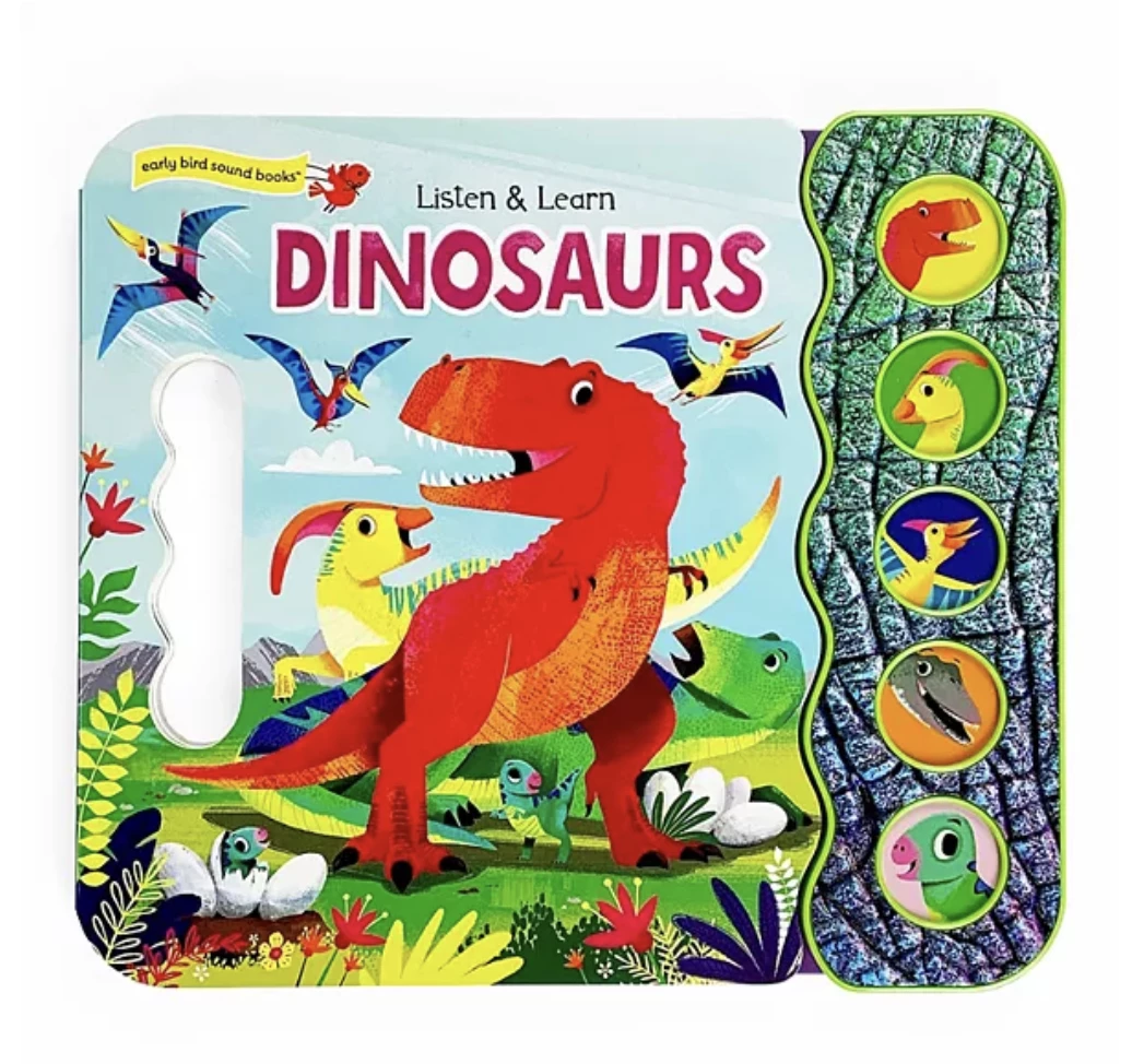 Explore and learn about dinosaurs and their prehistoric home! Colorful illustrations accompany dinosaur facts and sounds. Pushing the buttons helps little ones develop fine motor skills, and the textured dinosaur “scales” around the buttons provides an interesting sensory experience for any little explorer.