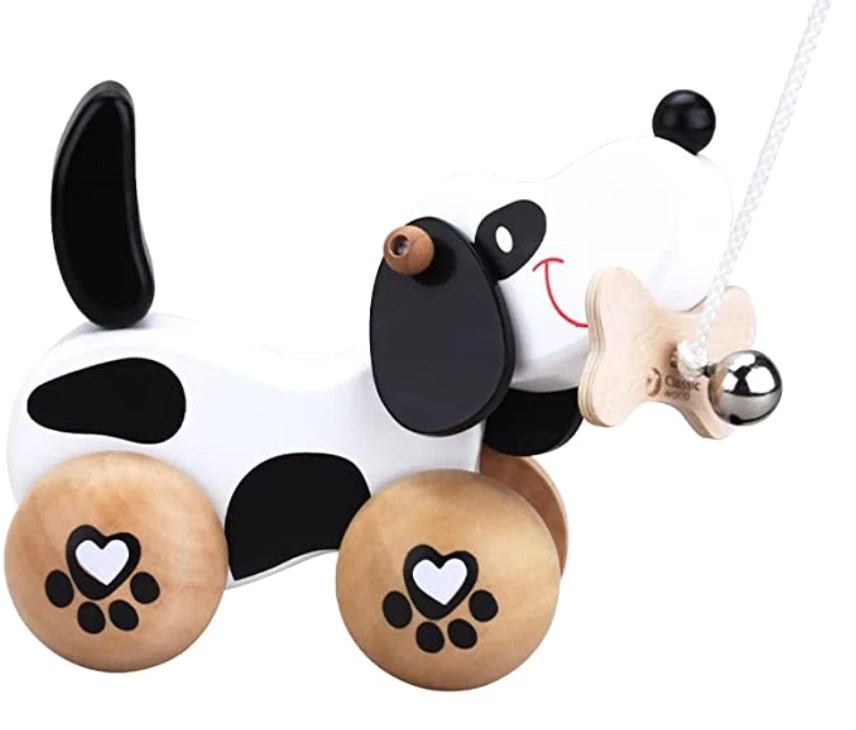 Push or pull this adorable little pull dog. Encourages imitative and imaginary play. Stimulates early walking and promotes role play and creativity.