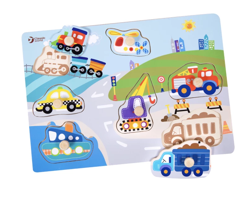 Our 8 pc Traffic themed puzzle has finger sized pegs for easy handling. You child will learn to name and identify things that move as they remove and match them back to the images on the board. Encourages problem solving and discovery.