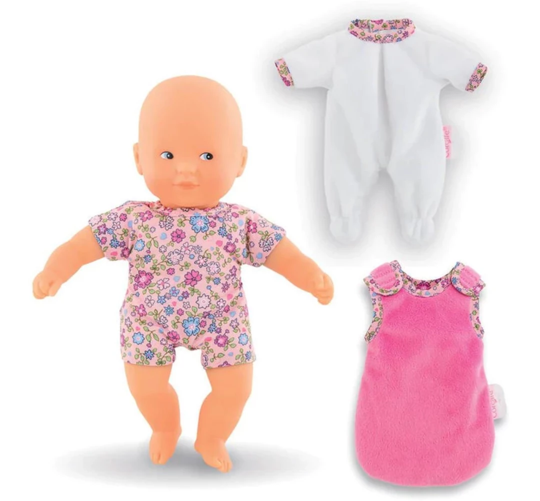 Mini Calin Good Night is a set containing one 8” lightweight Mini Calin that can be taken everywhere you go, pajamas and a bag sleeper. Hook-and-loop fastener on the pajamas and bag sleeper make dressing and undressing easy. The doll’s face, arms and legs are made of delicately vanilla-scented, soft-touch vinyl. Painted blue eyes. mon premier poupon Corolle: small baby dolls with their own clothes and accessories so even little ones can have early nurturing time.