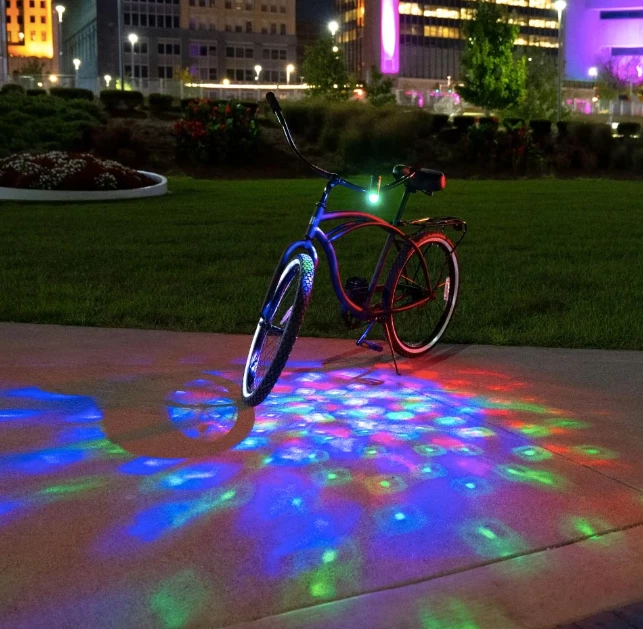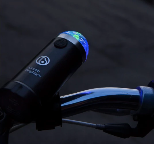Add a CruzinBrightz to your handlebars and get the party cruise going! Three colors of LED lights project on the ground in different combinations and patterns. Colors will swirl around your wheel as you cruise down the boulevard.