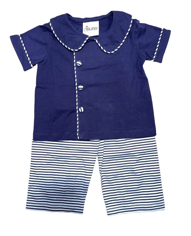 Boys Navy Knit Collared Shirt with Pull on Navy/Baby Blue Knit Pants.