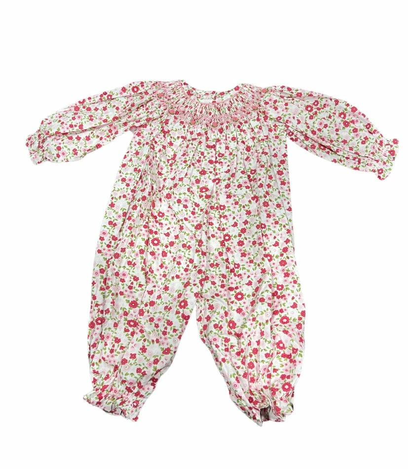 Girls Pink & Red Floral LS Smocked Romper.