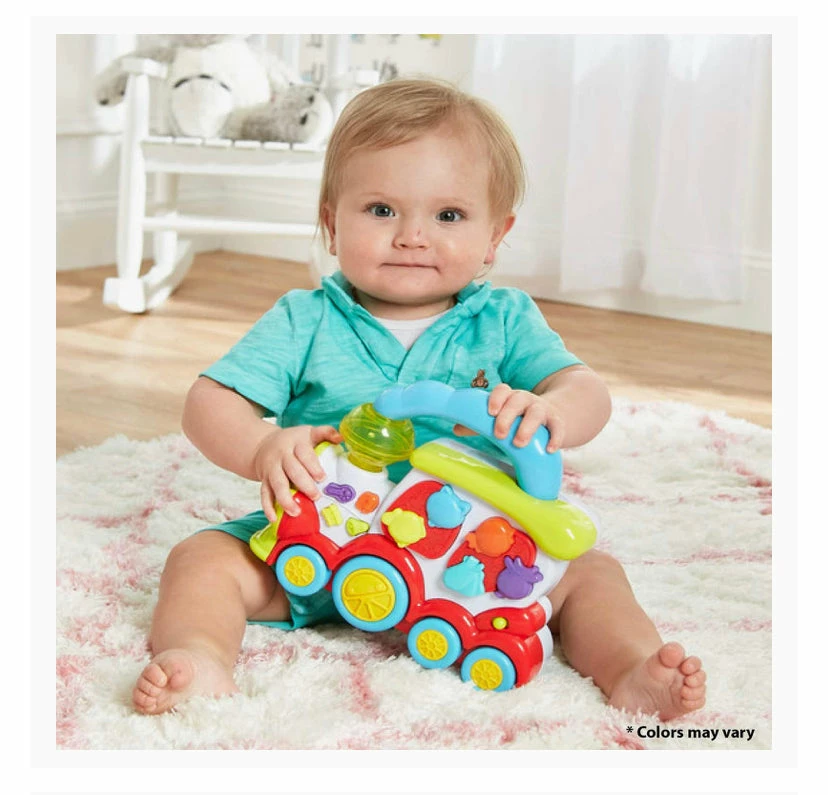 Choo Choo! Hop aboard this light up, music playing, animal train! With an easy to grab handle, your child can bring this toy wherever they want!Β Press the buttons to hear animal and train noises! If you press on the different animals, they will moo, quack, meow and bark. Will your child remember which sound goes with which animal? But, you can’t forget it’s also a train. The train makes choo choo noises and has a wonderful light up smoke stake making it fun and realistic!