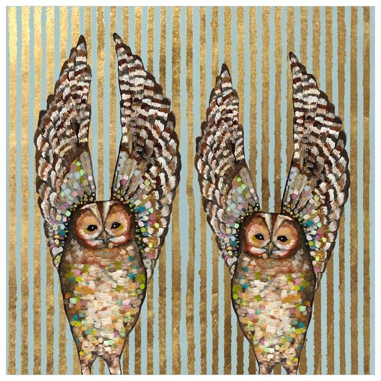 This owl duo is full of happiness and color. Share their joy by hanging this on your wall and you’ll smile every time glance this pair’s way. This artwork has hand applied gold metallic leaf accents and is stretched over MDF frame that is approximately 1.5″ in depth.