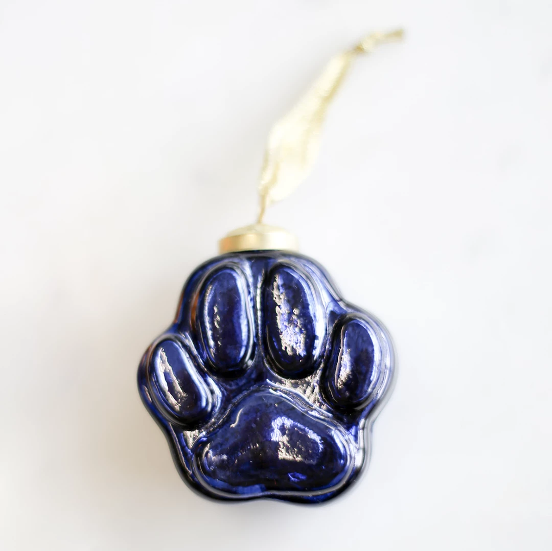 Paw shaped ornament in navy, measures 2.5″ in height and held on a small metallic ribbon.