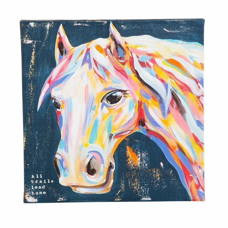 A gorgeous, horse painted canvas comes ready to hang in your home with the words “all trails lead home” stamped in the corner. Add this painting to your farm house decor for a whimsical touch and the colorful, hand-painted horse on a dark blue background will be just the pop of color your wall needs. This hand painted horse is a perfect addition to an aspiring equestrians room.
