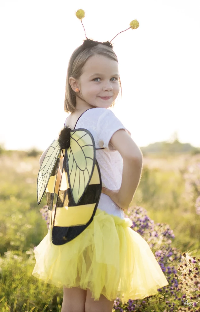 This is one cute little bee that you won’t mind buzzing in your ear. Our Bee-utiful 3 piece set includes a tutu skirt, wings and headband. The yellow tutu combines soft tricot with yellow sparkle tulle. A set of honeybee 4 piece wings is included in this bee outfit along with a springy antennae headband with yellow pompom tips. Finished both with fluffy marabou feather details.