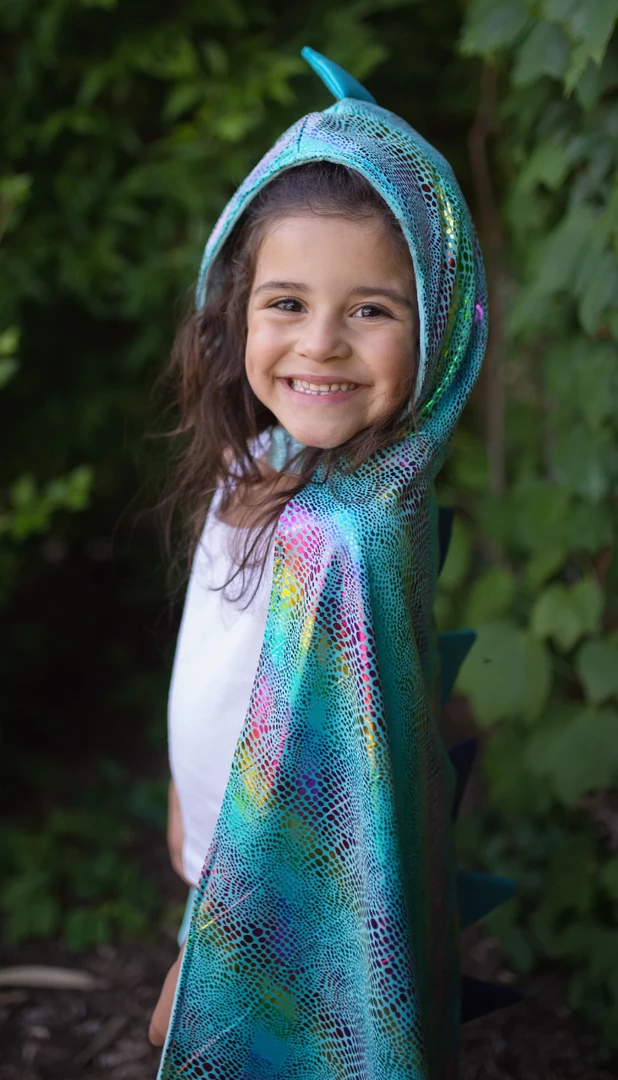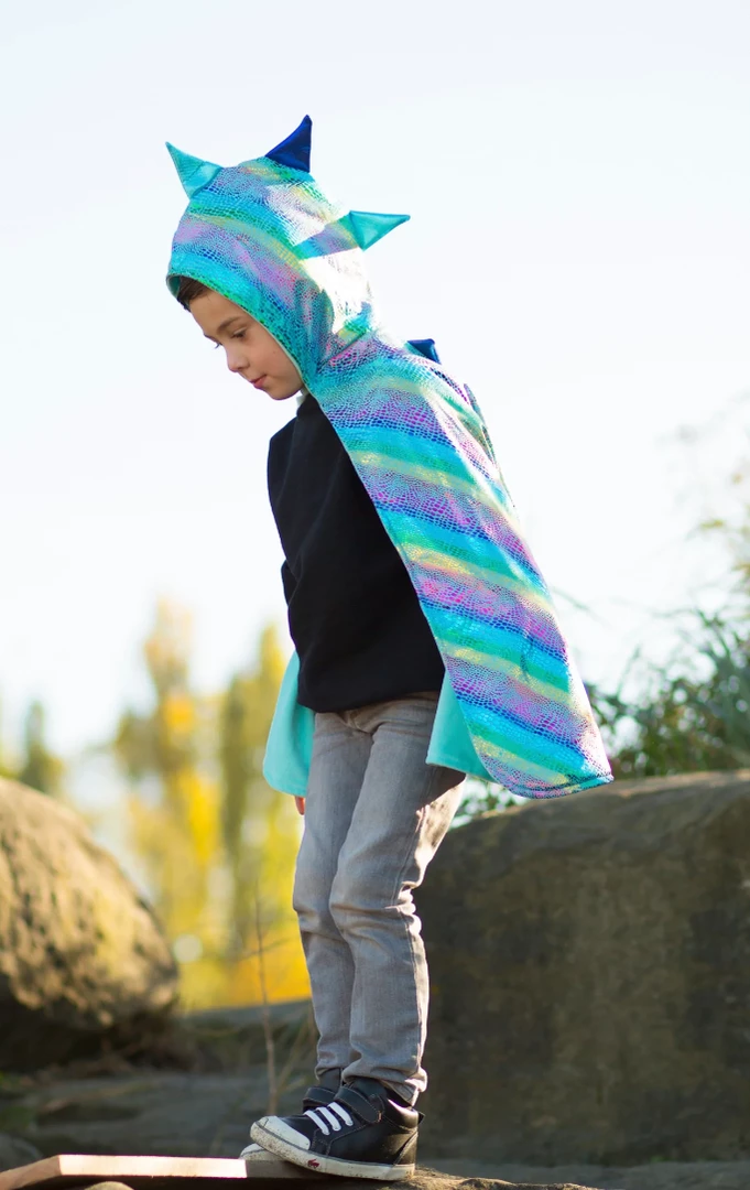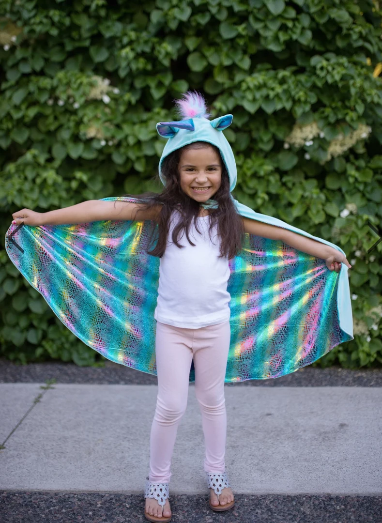 This reversible unicorn dragon cape is the ultimate fantasy cape! Bold bright colors of gorgeous aqua blue, lilac and pink, with shiny metallics and rainbow effects this cape is a winner! A bright dragon on one side equipped with protective scales from the hood all the way down the back, this cape turns into a soft fuzzy unicorn side with a faux fur mane and tail! Bright and beautiful, soft and comfortable, and machine washable, this cape is destined to be a favorite!