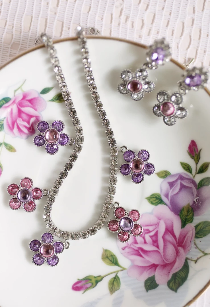 ย Sweet meets sophistication in The Audrey 5-piece jewellery set. This elegant boxed set includes two rings, a pair of clip-on earrings, and a matching necklace, all accented by floral-shaped charms and studded with soft pink, diamond, and lilac coloured gems.