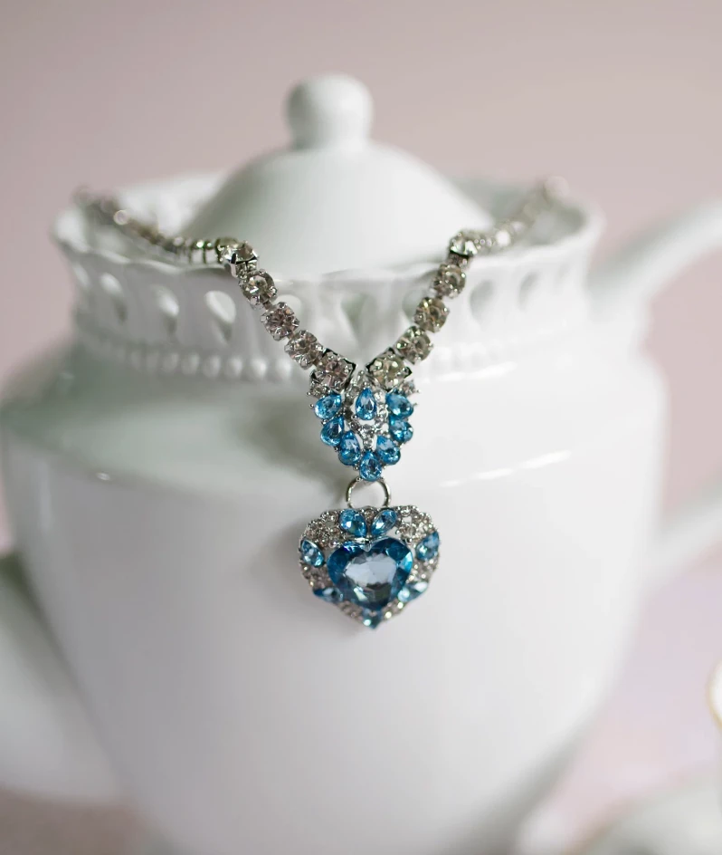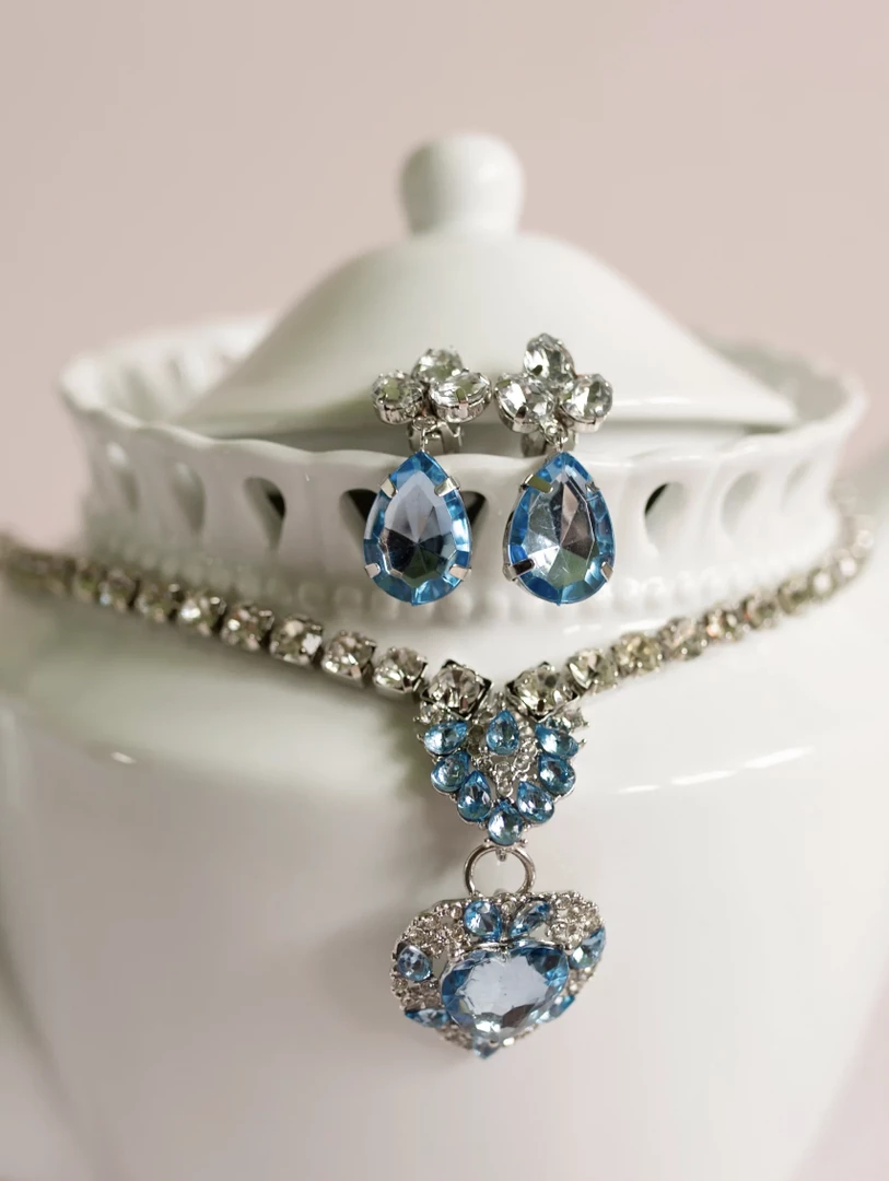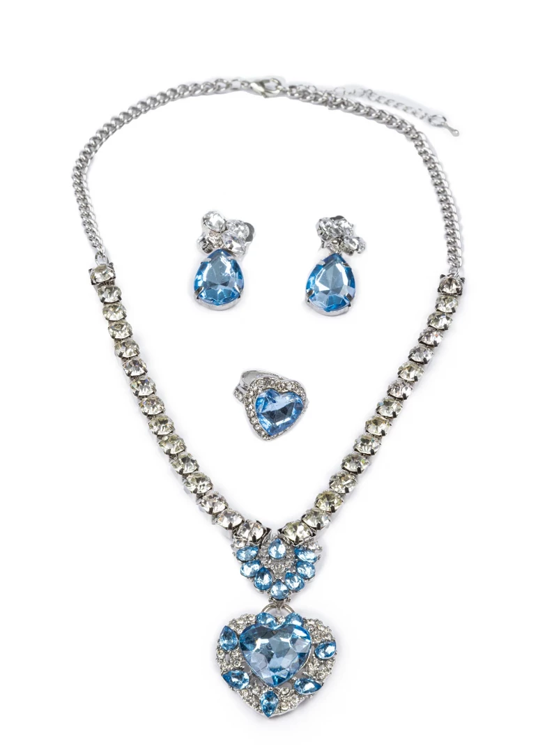 Classic glamour gets a modern twist with The Marilyn 4 Piece set. This bold and beautiful boxed-set includes blue & silver clip-on earrings, a heart-shaped ring, and a coordinating necklace jam-packed with jewels.