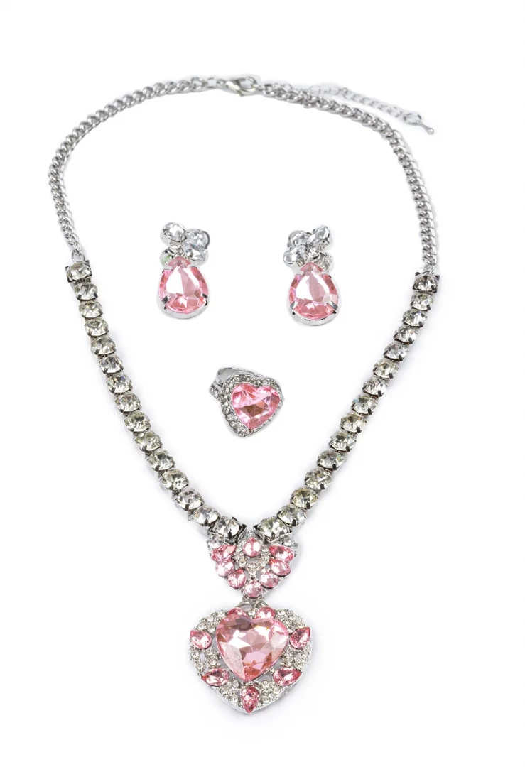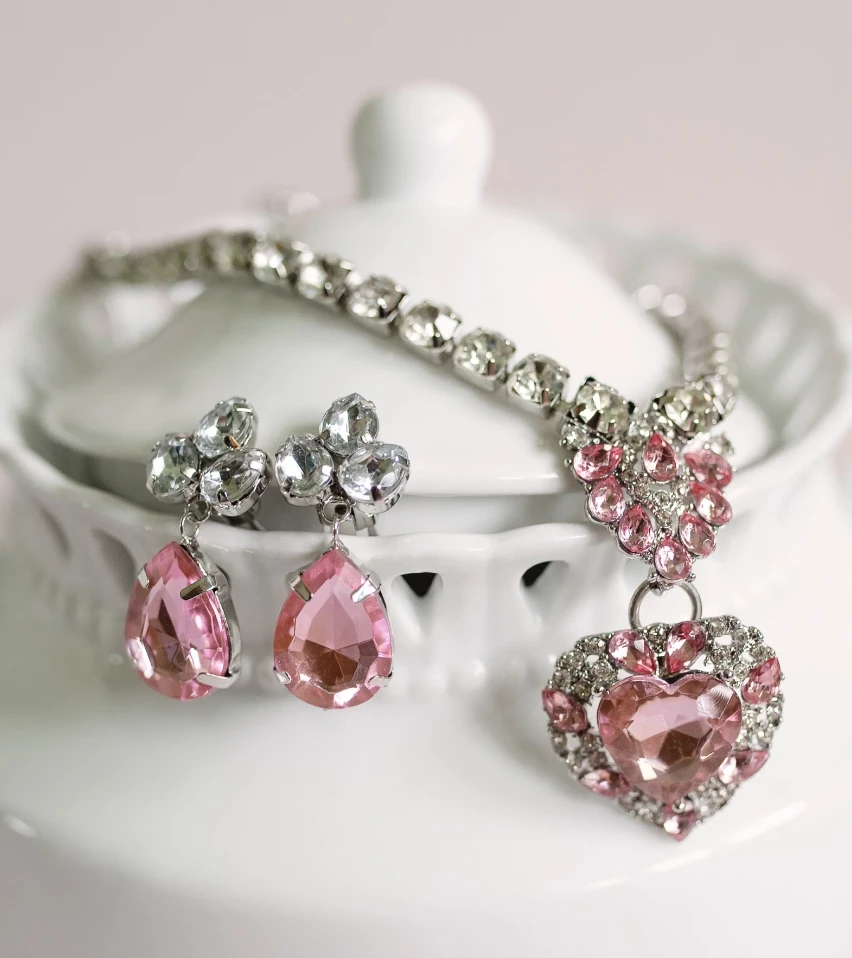 Classic glamour gets a modern twist with The Marilyn 4 Piece set. This bold and beautiful boxed-set includes pink & silver clip-on earrings, a heart-shaped ring, and a coordinating necklace jam-packed with jewels.