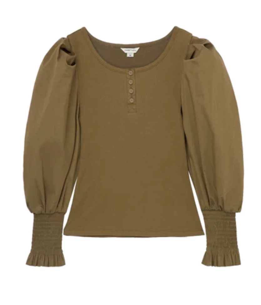 Our knit to woven henley showcases some trendy puff sleeves with smocked cuffs. Pair with her favorite Habitual jeans!
