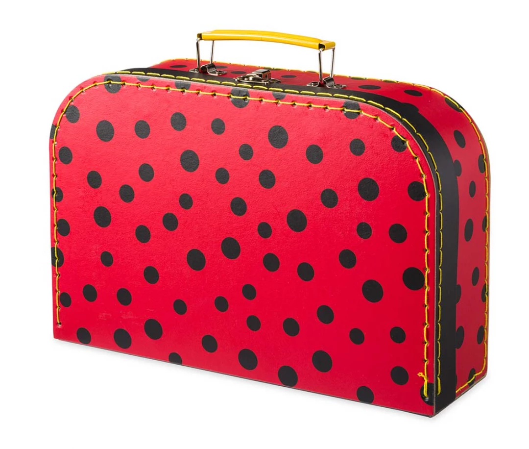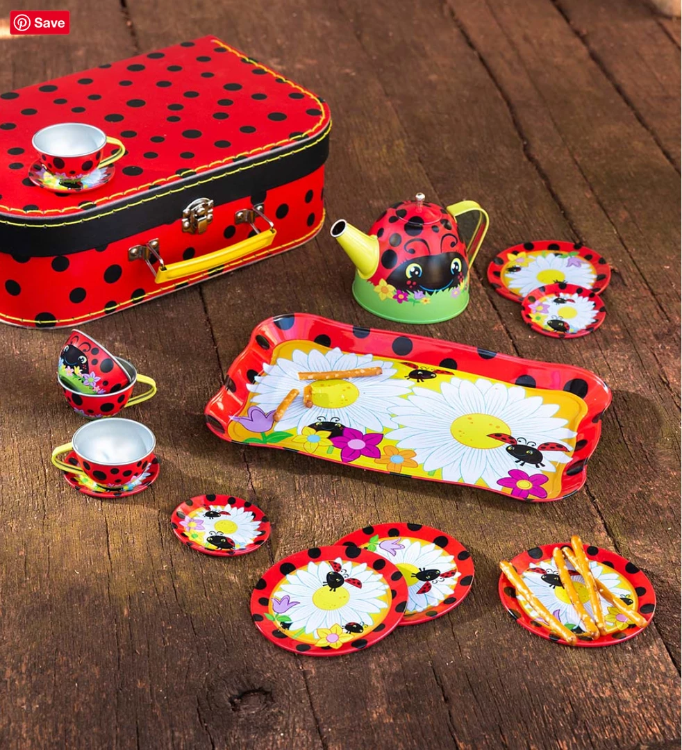 Everybody loves a ladybug! Perfectly sized for little hands, this 15-piece Ladybug-Themed Tin Tea Set includes a lidded teapot, four plates, four cups and saucers and a serving tray. Just right for pretend tea parties; our set is food-safe but not watertight. Pieces pack neatly into a durable, polka dotted cardboard suitcase (11ยฝ”L x 3ยฝ”W x 7ยพ”H), for little ladybugs to โfly awayโ for traveling tea parties. Wash thoroughly before and after use.