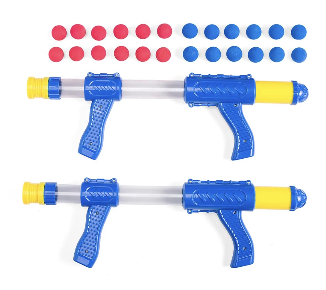 - Set includes two 17″L plastic blasters, 12 red balls and 12 blue balls