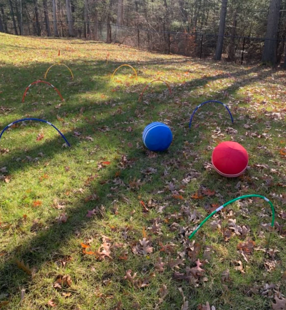 Kickball plus croquet equals….super-sized outdoor active play! This outside game for kids combines the fun of running and kicking a ball (kickball), plus the added attraction of guiding it through a course of wickets (croquet). Practice your aim AND kicking skills while playing a fun game!