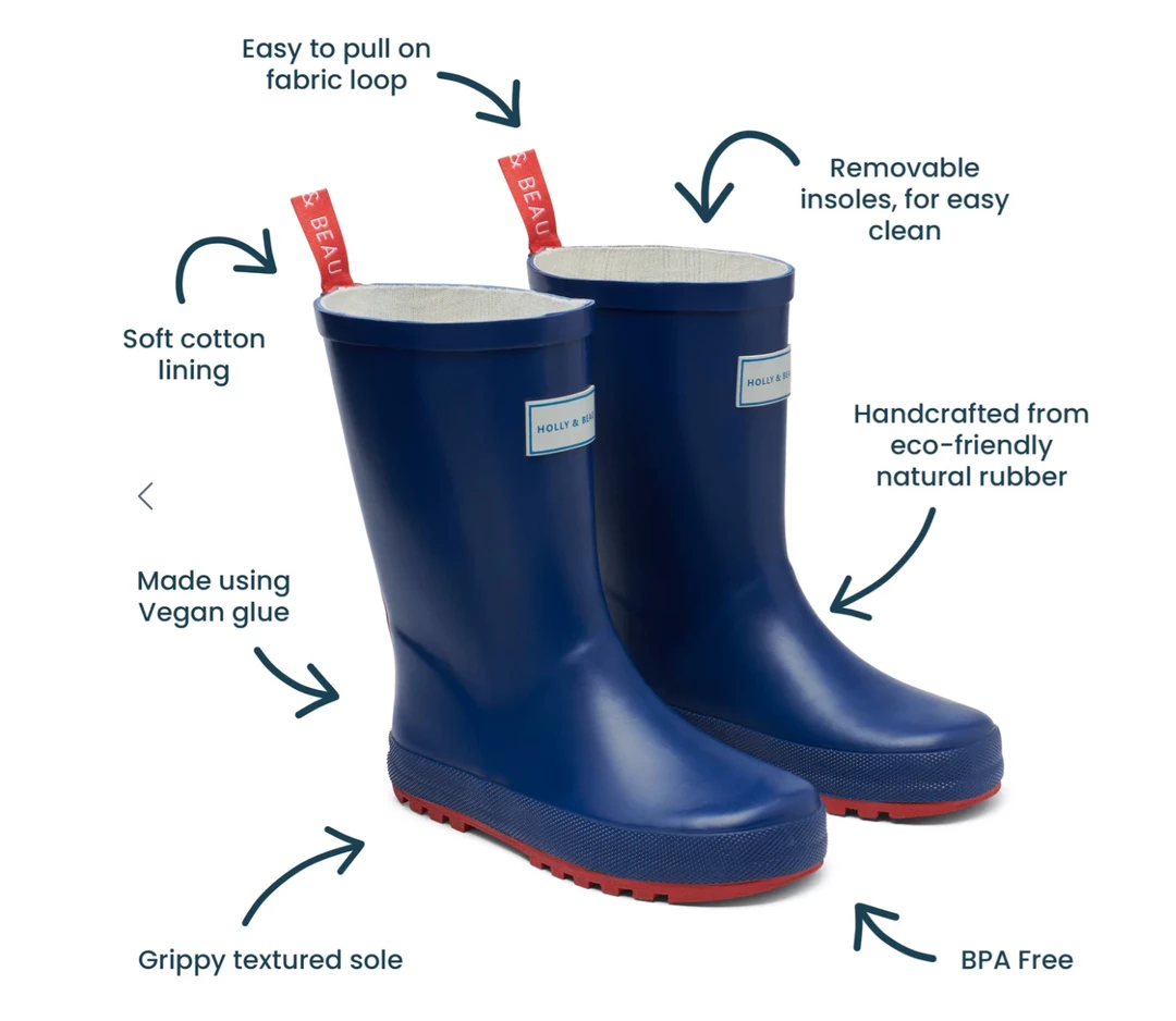 Handcrafted from eco-friendly vulcanized natural rubber, these highly durable and waterproof rain boots are perfect for puddle splashing. Made using Vegan friendly water based glues and free from BPA and phthalates. A grippy textured sole and a soft cotton lining ensures little feet are comfortable and ready for any outdoor adventure.