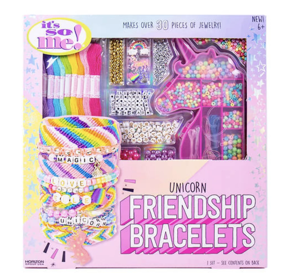 - Everything you need to design your own line of magical accessories is inside the Itโs So Me!ยฎ Unicorn Friendship Bracelet set! Follow the fully illustrated instructions to learn how to master the art of bracelet-making and create eye-catching designs, like chevrons, beaded macramรฉ, and braids. Then, accessorize with pearl beads, a shell charm, a unicorn pendant, and more! Plus, with over 100 alphabet letters and accent beads to mix and match itโs easy to create personalized accessories to wear and share with your squad!