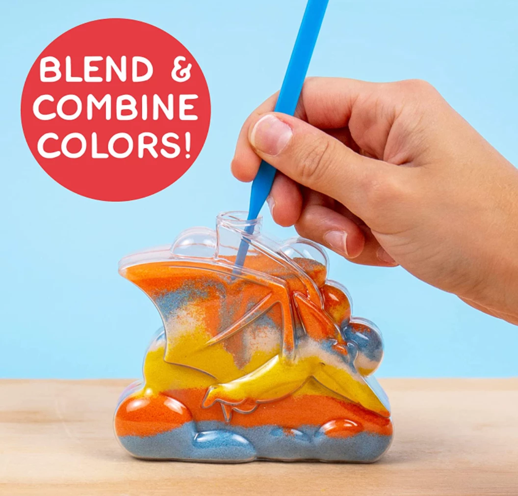 - CREATE DINO-MITE SAND ART: Add layers of vibrant sand and sparkling glitter to a variety of dino-themed bottles & watch them transform into a prehistoric world where dinosaurs roam!