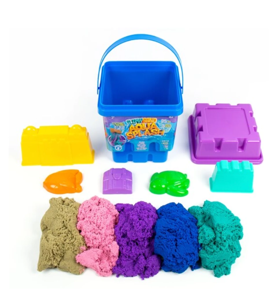 Slimy Sand Aqua Splash stretches, expands, and takes shape in and outside of water! This 10-piece sensory play set comes with a case that functions as both storage and a sand castle mold fill it with water or use it to create your own moldable, stretchable sea world! Whether you use the molds to create fun sea creatures in the water or sculpt, stretch, and crush with your hands Slimy Sand Aqua Splash is water-resistant, so it wonβt fall apart or dissolve while you play! Squish, shape, squeeze, and stretch 5 ready-made Slimy Sand Aqua Splash colors including blue, purple, teal, pink, and natural sands! Includes 5 molds in a variety of under-the-sea themes, including a turtle, fish, treasure chest, and more! Hassle-free and easy to clean up just play inside the bucket to create your underwater sandscapes! Strengthen fine motor skills while simultaneously relieving stress as you squish and squeeze the Slimy Sand Aqua Splash! Let your Slimy Sand Aqua Splash air dry in the included bucket, then store in the reusable bags included!