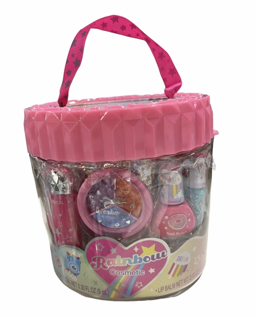 Set includes: 2 scented nail polishes, 2 glitter toe separators, 1 nail file, 1 eye shadow palette, 1 lip balm, & 1 glitter lip gloss.