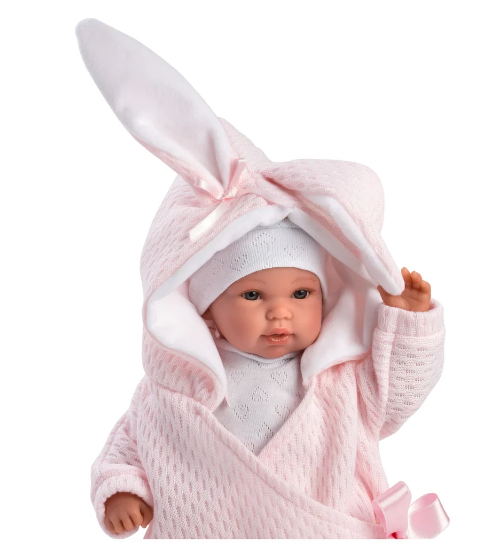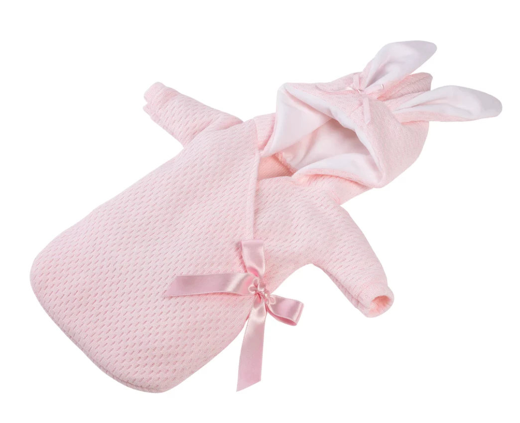 Avery has a sweet newborn baby face and blue eyes. Avery is dressed in a matching white onesie and hat with heart shaped design under a pink knit blanket coat with hood with bunny ears. Outside of coat is tied with a pink ribbon.