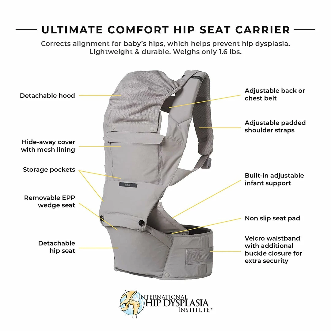 โข Detachable hip seat: Use for feeding support or extra support for heavier baby to evenly distribute weight and prevent leaning or twisting for parents