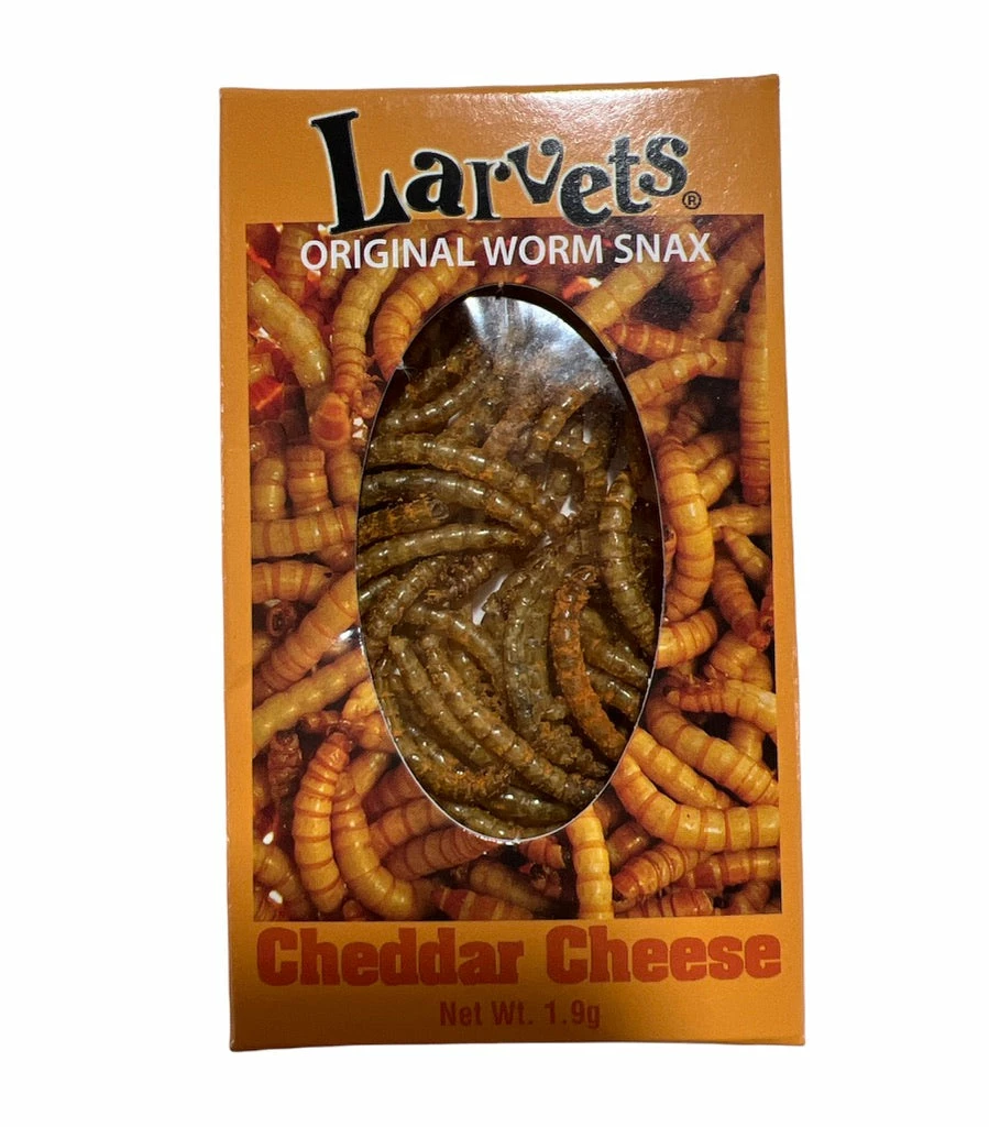 Real larva, deliciously seasoned. Offered in three flavors: BBQ, Cheddar Cheese, or Mexican Spice.