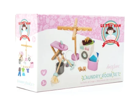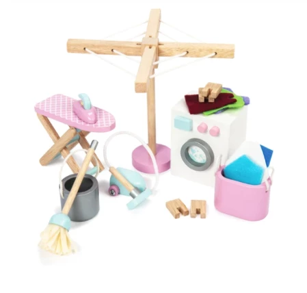 Comprising of aΒ washing machine, washing line, iron & ironing board, 4 pegs, felt clothes, a broom & bucket, vacuum cleaner and more.