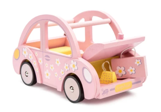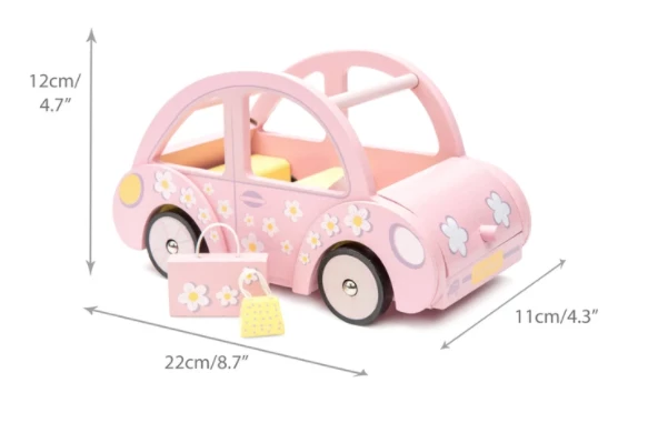 Dolls can zip around town in this prettyΒ pink wooden car. It even comes with cute matching luggage to place inside.Β Dolls sold separately.